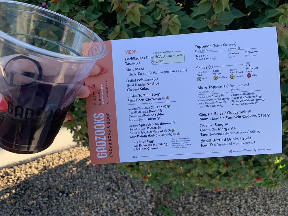 Gadzooks Enchiladas and Soup is a Mexican soup restaurant located in Phoenix, AZ. They offer delivery, takeout, and catering services, making it convenient for all types of diners. The menu includes vegan and vegetarian options, ensuring there is something for everyone. The ambiance is described as classy and quiet, perfect for a casual meal or group gatherings. The Enchiladas and Festival Tacos are standout items, packed with flavor and customizable to your liking. The sides, such as Chips & Salsa and Sweet and Spicy Cornbread, add a delightful accompaniment to your meal. Overall, Gadzooks Enchiladas and Soup offers a unique dining experience with a focus on quality ingredients and exceptional service.